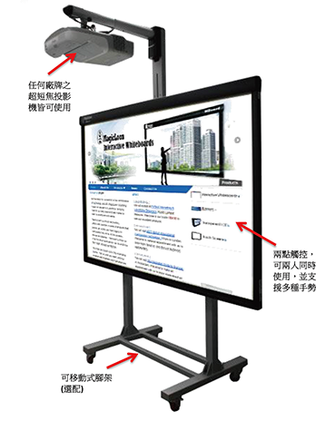提供老師講課方式的選擇,可使用白板筆或投影機,並可加入觸控互動教學